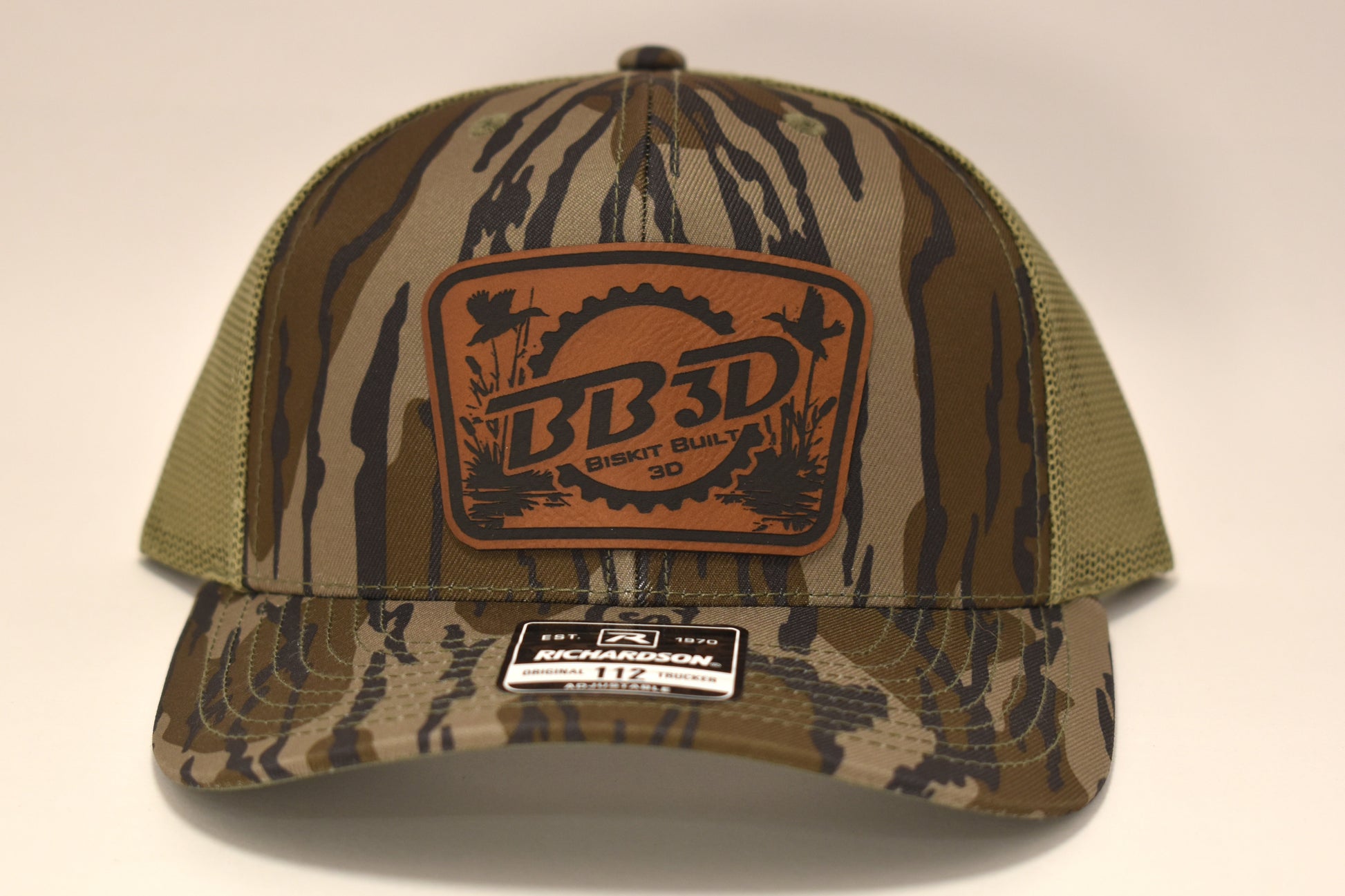 Rep the brand in the blind or around town. This Richardson 112 snapback trucker hat features the Mossy Oak Bottomland pattern with a custom leather Biskit Built 3D logo patch by Bro’s Graphics. Mid-profile fit, mesh back, and adjustable snap closure for all-day comfort.